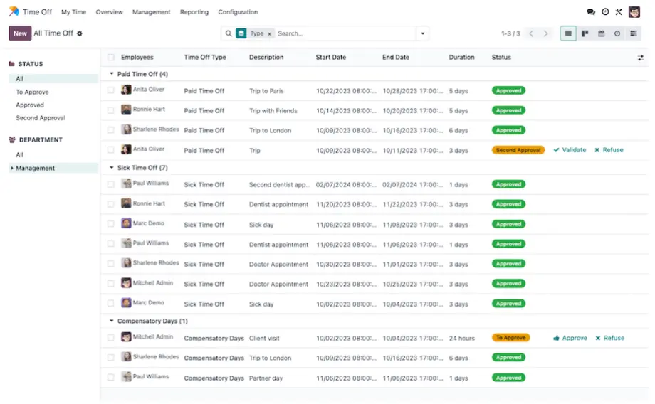 تقديم طلبات الإجازة، تتبع رصيد الإجازات، وإدارة حالات الغياب.