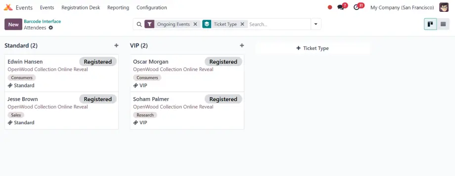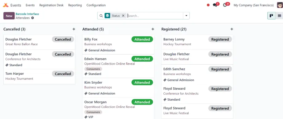 يسمح أودو للمستخدمين بالتسجيل في الفعاليات عبر الإنترنت، مما يبسط عملية التسجيل ويوفر الوقت.